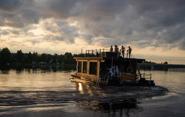 The cruise price includes a heated wooden sauna, Oulu River cruise with swimming breaks, and use of the sauna boat. The sauna boat has an indoor lounge with a view, toilet, wood-fired sauna, and gas grill.